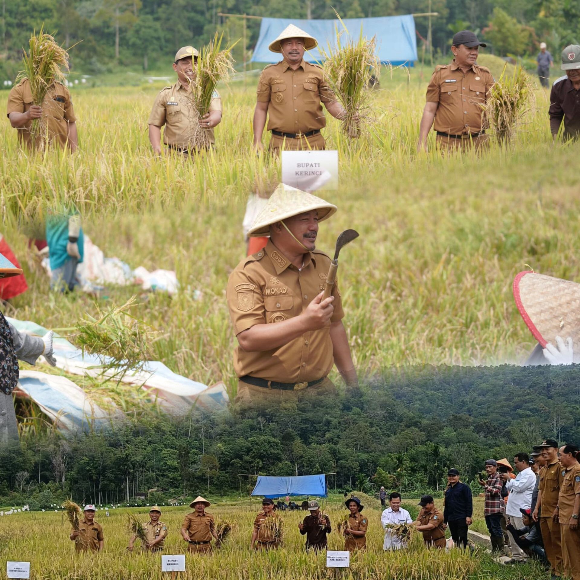 RUANGLENSA.COM, KERINCI – Suasana semarak mewarnai panen raya padi di Desa Talang Kemulun, Kecamatan Danau Kerinci, Senin (13/10/2025). Bupati Kerinci Monadi, S.Sos, M.Si hadir langsung dan ikut memanen padi bersama warga.