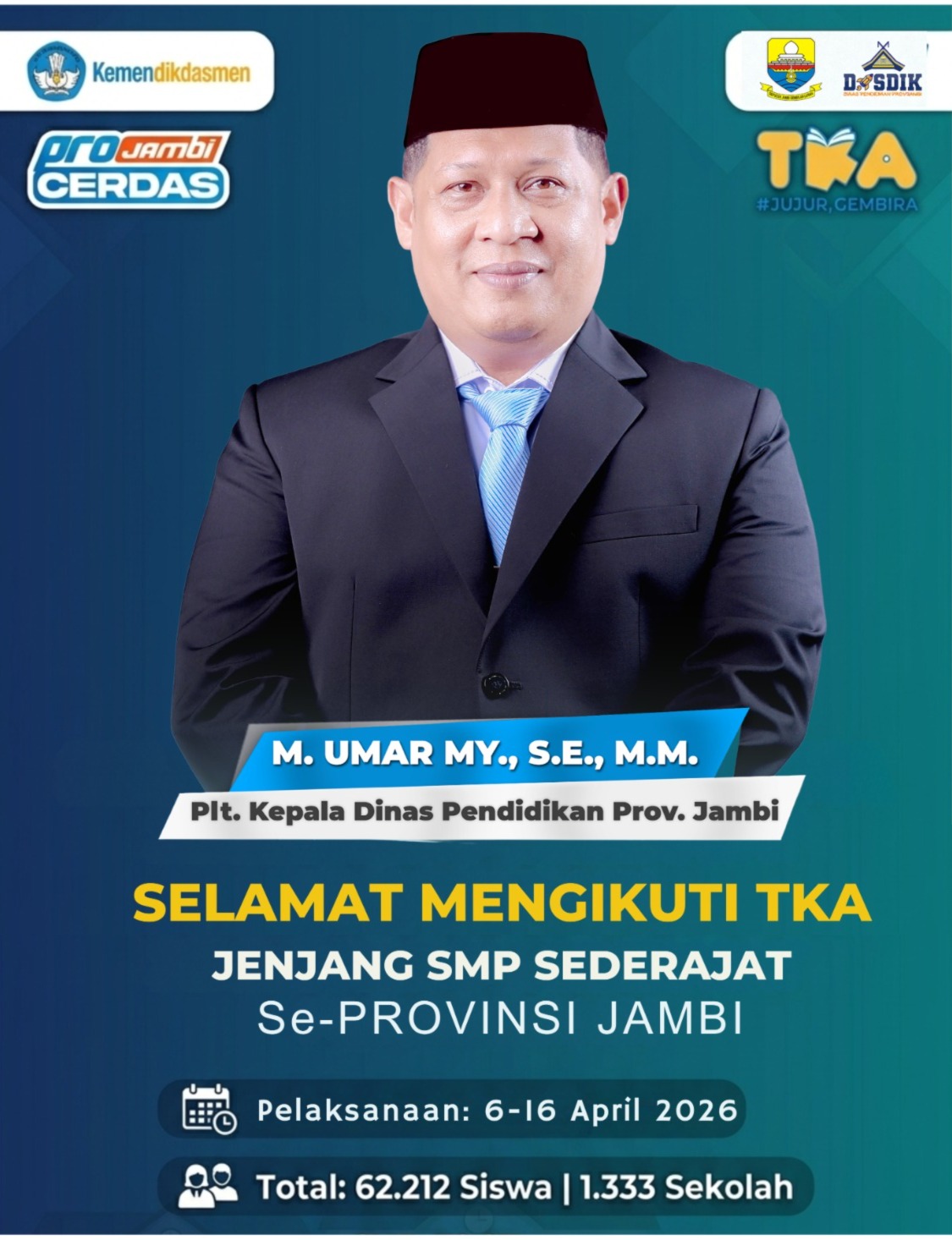 RUANGLENSA.COM, JAMBI – Pelaksana Tugas (Plt) Kepala Dinas Pendidikan Provinsi Jambi, M. Umar MY, SE., MM memastikan kesiapan akhir pelaksanaan Tes Kemampuan Akademik (TKA) jenjang SMP/MTs sederajat bagi siswa kelas IX se-Provinsi Jambi.